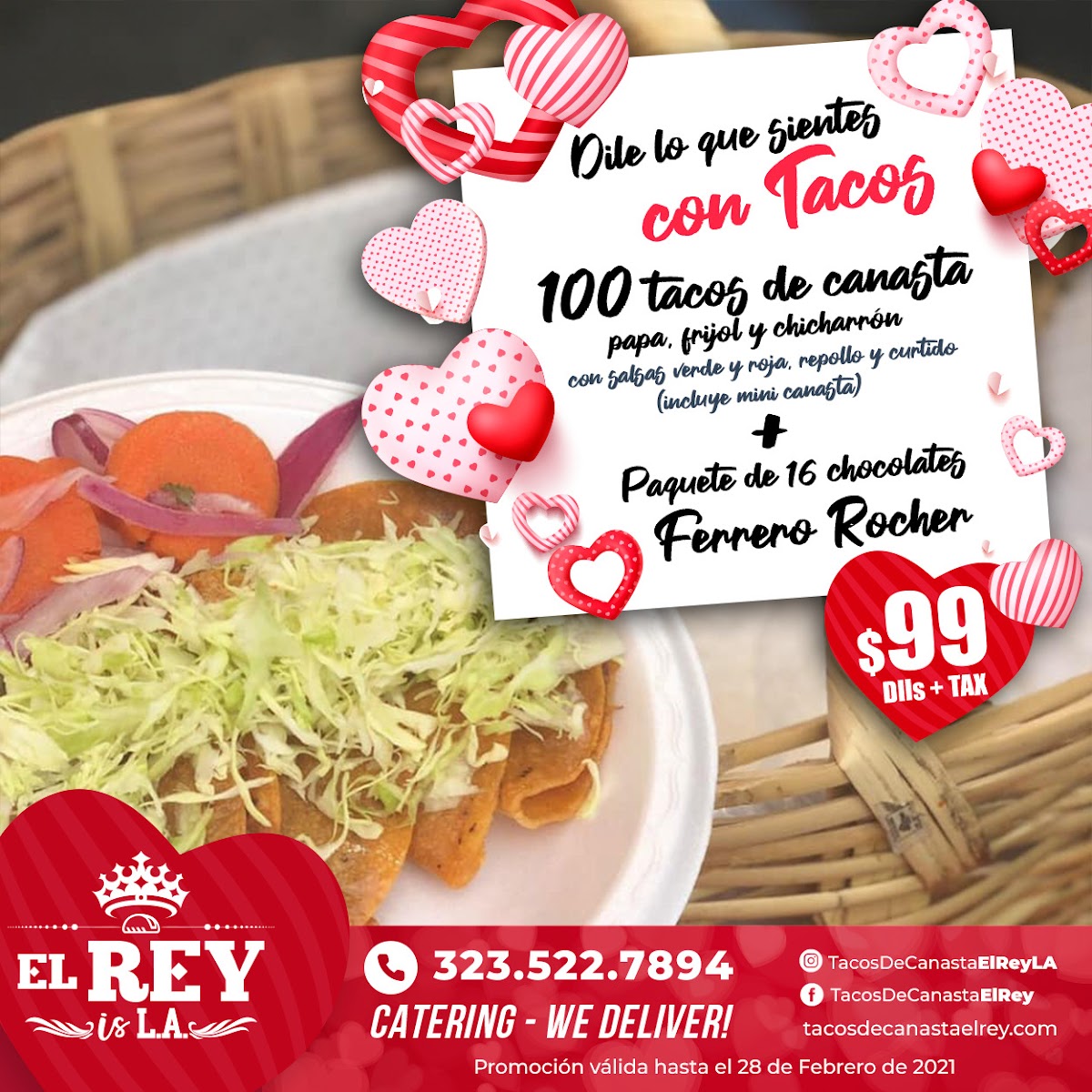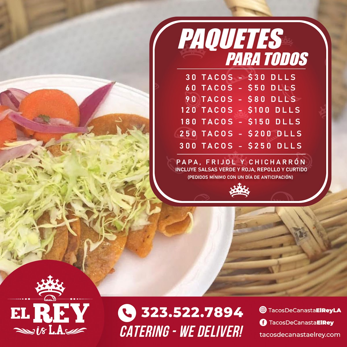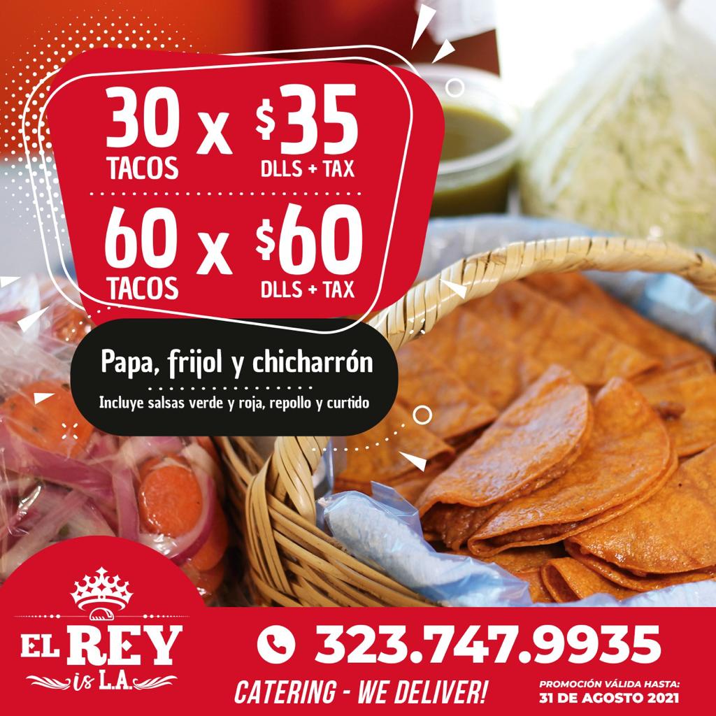 Tacos De Canasta El Rey offers a simple yet delicious taco experience with a focus on their specialty, Tacos de Canasta. Whether you're craving a small bite or feeding a crowd, they have a variety of options. The menu features 30 Tacos de Canasta, 60 Tacos de Canasta, 90 Tacos de Canasta, 120 Tacos de Canasta, and even 180 Tacos de Canasta, allowing customers to choose according to their appetite or group size. These tacos come packed with flavorful fillings, offering a satisfying and authentic taste of Mexican street food. With a range of quantities and the option to cater to larger gatherings, the restaurant delivers both quality and convenience for taco lovers in Los Angeles.